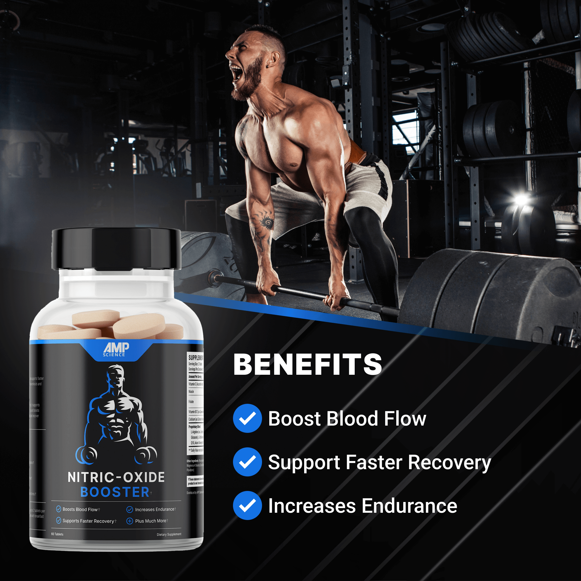 AMP Science Nitric Oxide Booster is a natural performance formula designed to support blood flow, endurance, and muscle recovery. Featuring key ingredients like L-Arginine, L-Citrulline, Ginseng, and Taurine, it helps your body deliver oxygen and nutrients where they're needed most — helping you push harder and recover faster.,This clean, stimulant-free blend is ideal for anyone looking to improve workout performance, boost energy naturally, and feel stronger throughout the day.